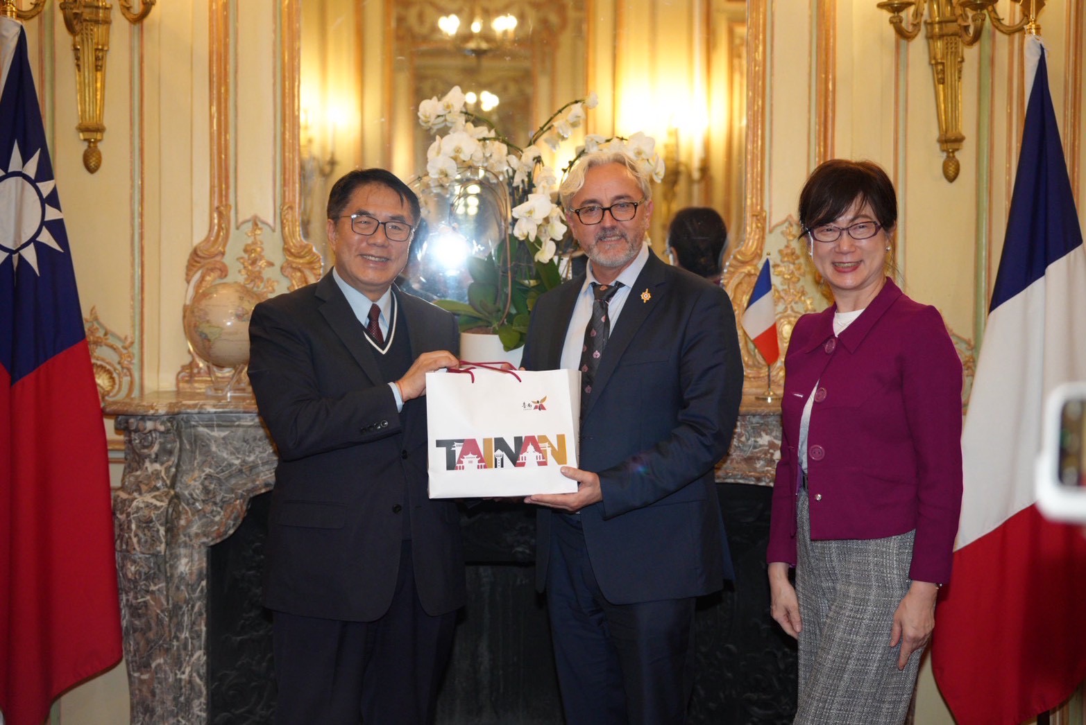 台南市長黃偉哲訪問法國期間,於當地時間4日造訪駐法國台北代表處,並在郝培芝大使的陪同下與法國國民議會友台小組副主席馬堤諾議員(Éric Martineau)會晤,三方就綠能政策、農業貿易、地方政治及國際情勢等議題進行深度會談。