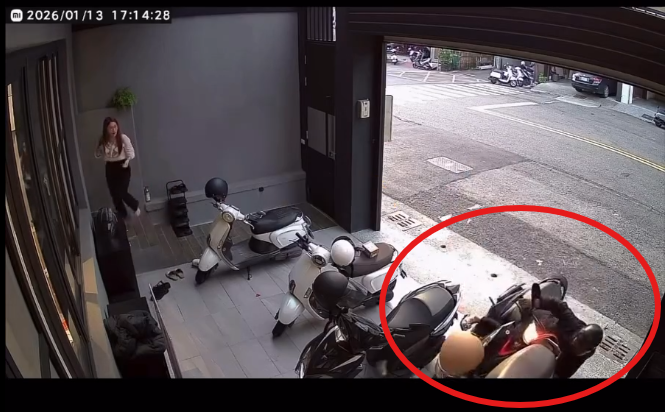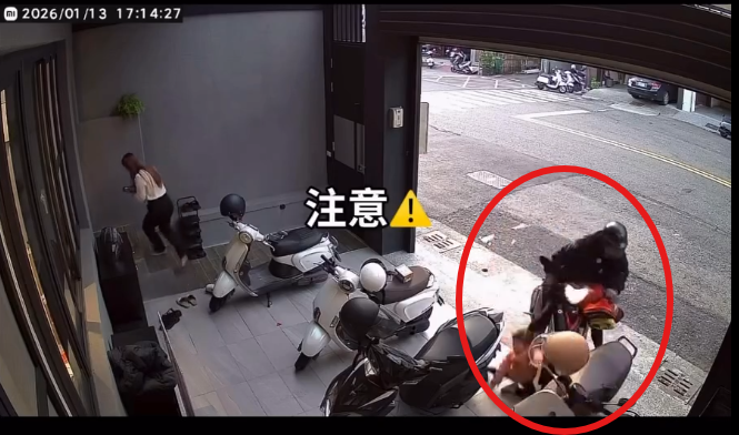 從監視器畫面可以看到,事發當時是2026年1月13日下午5點14分,家長停好車後,小朋友準備下車,沒想到一伸手就轉到油門,機車立刻失控往前衝,場面相當驚險。