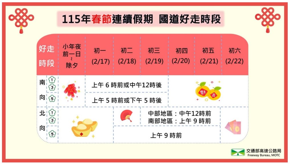 1.2月17日(初一)至2月19日(初三),上午時段南向車流量大,桃園、新竹及彰化瓶頸路段易有壅塞情形。建議用路人早上6時前或中午12時後出發。