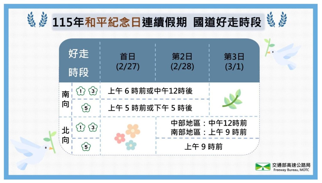 2.2月28日及3月1日,中部地區北向用路人建議中午12時前出發,南部地區北向用路人建議上午9時前出發。