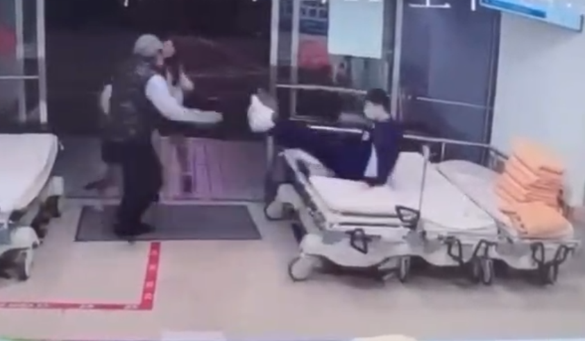 台中澄清醫院中港院區發生急診暴力事件,1名急診室男員工從櫃台飛身出去欲制止動手打人的嫌犯。翻攝杜承哲醫師臉書