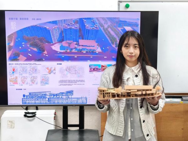其中,學生蔣幸芸以作品〈果貿市場,重新想像-繫〉榮獲優選,作品以高雄左營果貿市場為基地,重新梳理市場、社區與城市之間的空間關係,透過動線與結構設計,回應不同世代使用者的日常需求,呈現市場作為公共生活核心的可能性,獲得評審高度肯定。