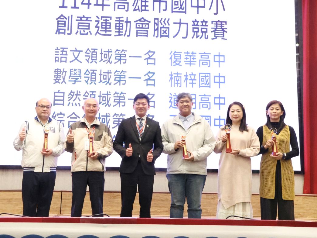 此外,114年高雄市國中小創意運動會腦力競賽亦傳來捷報,復華高中(國中部)、楠梓國中、道明高中(國中部)、三民國中與五福國中分別榮獲語文、數學、自然、綜合與藝術領域第一名,顯示本市在多元智能與跨域整合教學上的成果。