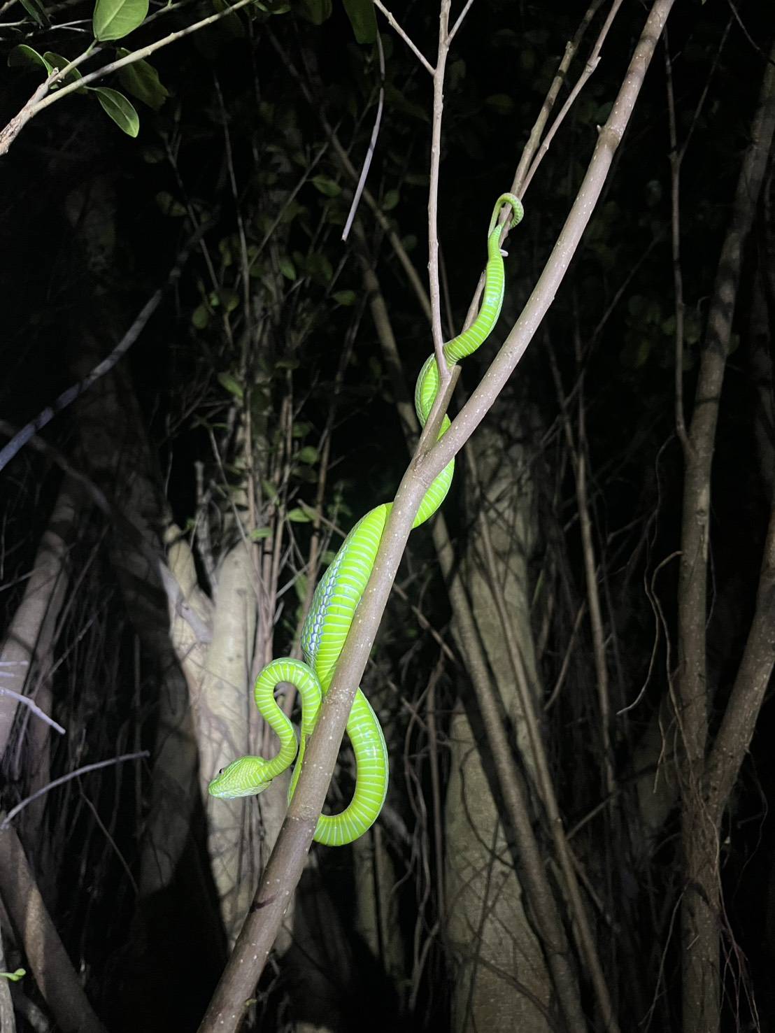 夜間觀察發現美麗的赤尾青竹絲,可愛的孩子們沒有很害怕的一直往前靠近,聆聽專業老師的介紹